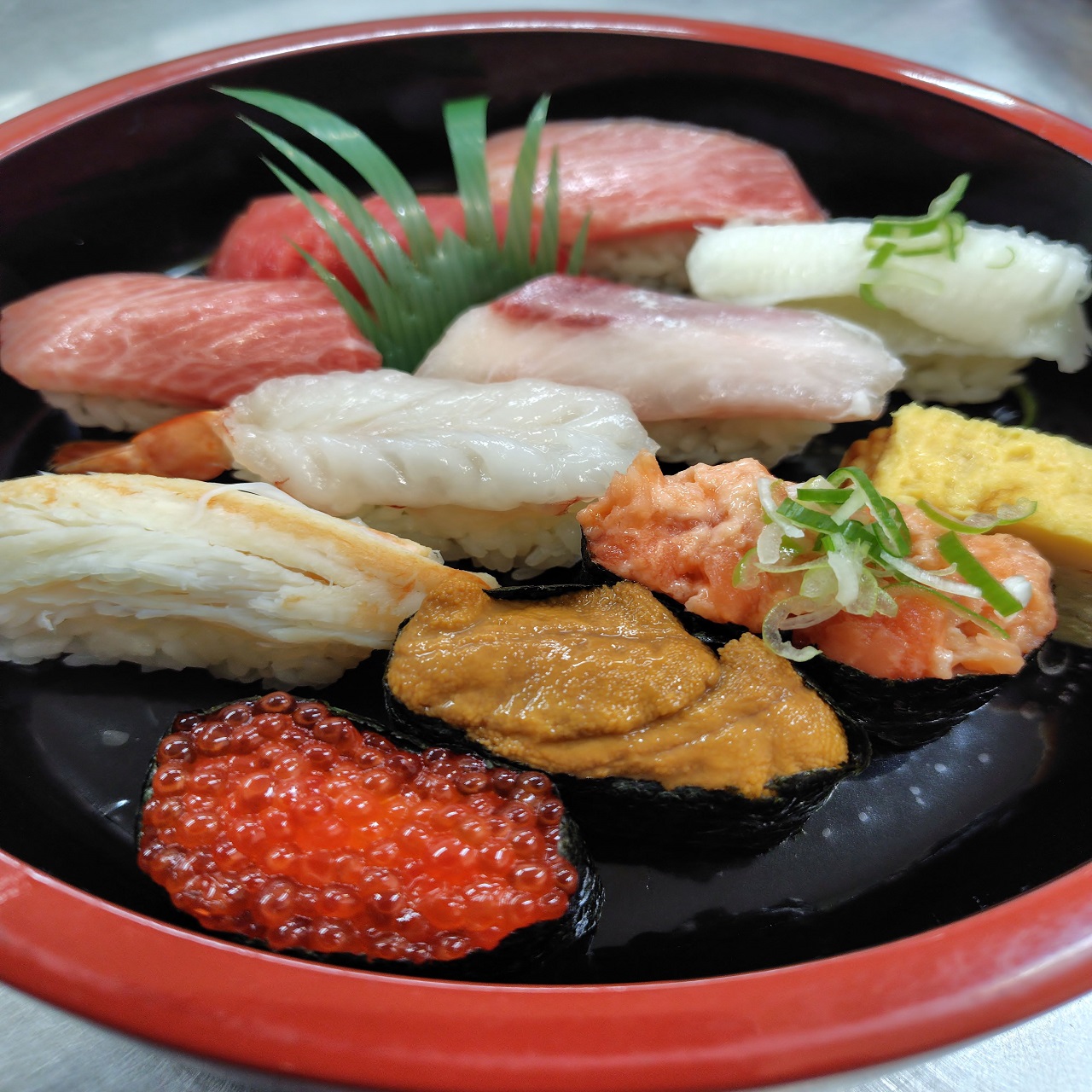 (10貫1玉) 大トロx2・中トロ・ズワイガニ・カンパチ(鯛)・生エビ エンガワ・イクラ・ウニ・サケトロ・切玉子 贅沢な一人桶です。