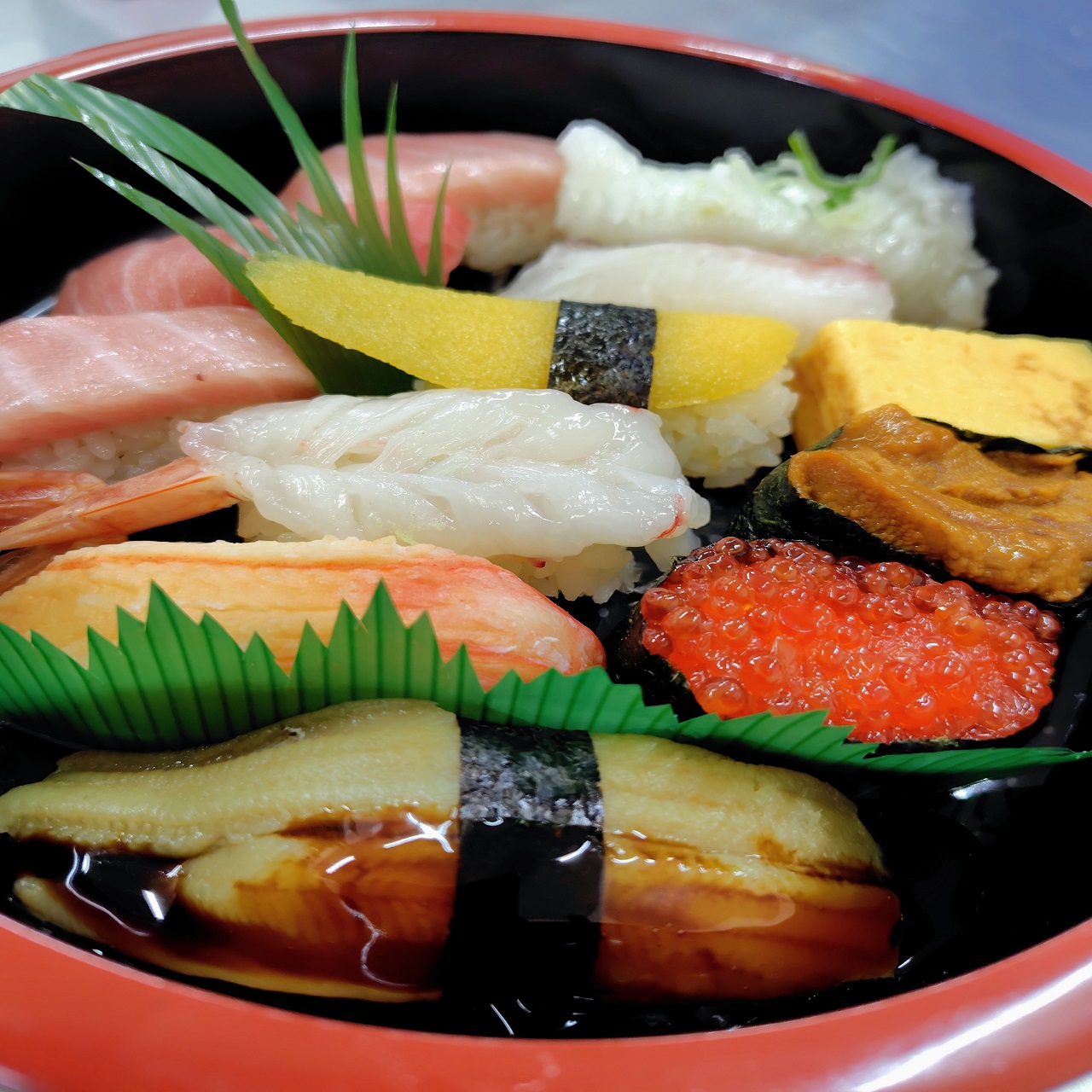 (11貫1玉) 大トロx2・中トロ・大穴子・ズワイガニ・生エビ 数の子・タイ・エンガワ・イクラ・ウニ・切玉子 贅沢な一人桶です。
