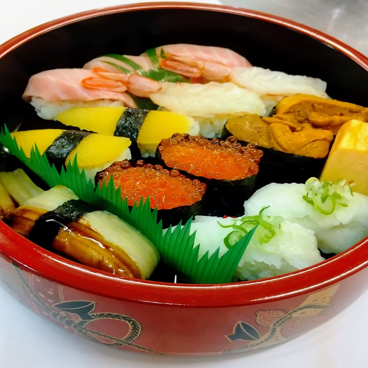 (14貫1玉) 大とろ3・数の子2・生エビ2・いくら2・うに2・エンガワ2・大穴子1・切玉子 極上 にぎりです。